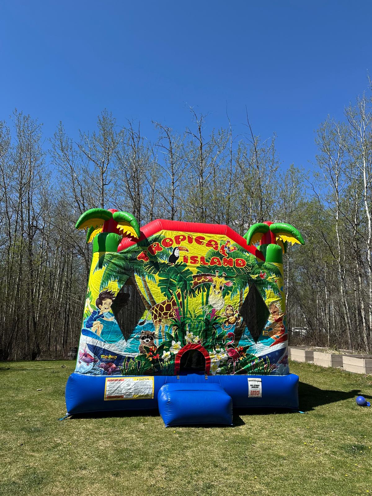 The Tropical Island Combo is a vibrant inflatable bouncy castle perfect for children's parties and events. Featuring a tropical theme with palm trees and beach graphics, its spacious 18x12 ft. bounce area provides ample room for kids to play safely. Adding fun like a basketball hoop, climbing wall, and slide guarantees hours of entertainment. Measuring 15'10" W x 20'4" L x 14'6" H, it fits well in most outdoor spaces.
