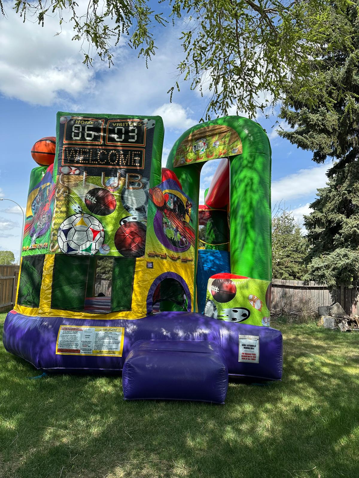 Elevate your outdoor event with the Backyard Combo Sports inflatable! This versatile bouncy castle features a spacious 10x14 ft. bounce area, a basketball hoop, a climbing wall, and a thrilling slide for endless fun. Ideal for children aged three and up, it provides safe and active entertainment for larger gatherings. Measuring 14'10" W x 17'8" L x 13'10" H, it fits perfectly in most backyards, making it the perfect addition to any occasion.